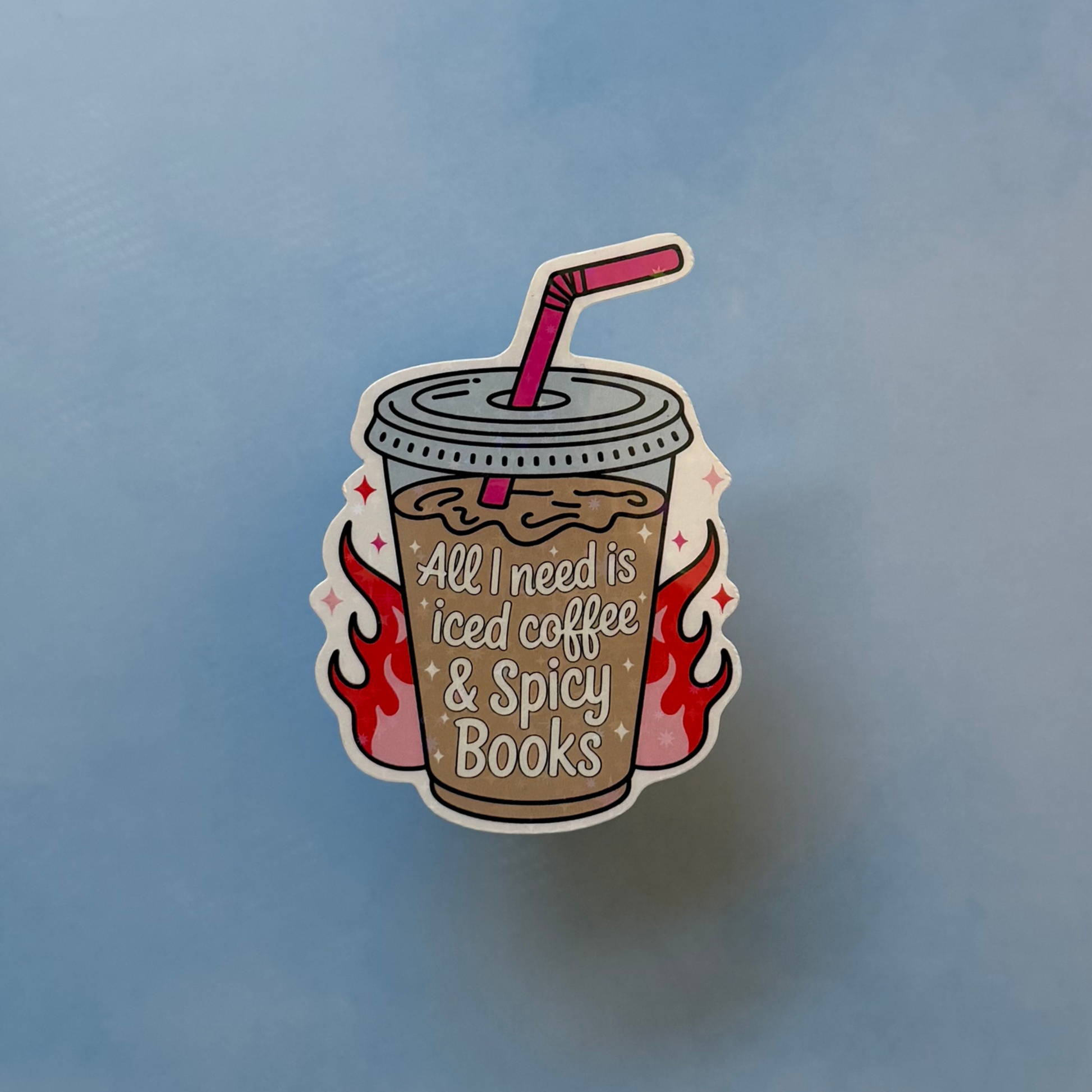 ALL I NEED IS ICED COFFEE & SPICY BOOKS ā Holographic Sticker